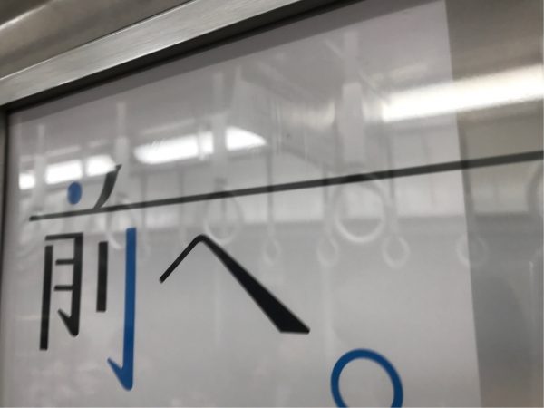 電車に乗ってドアのところに立つと、『前へ。』が目に入ってきた。