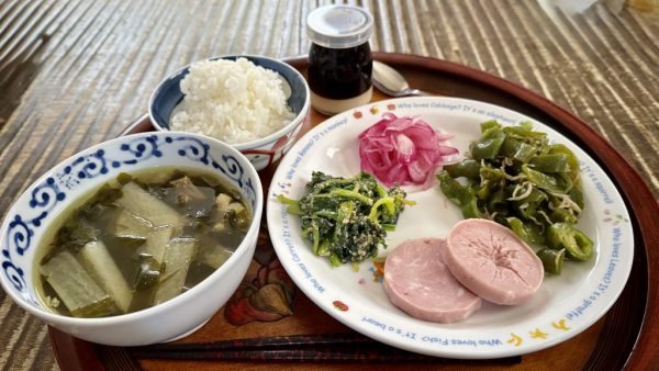玉葱の甘酢、昨夜の残りものスープ、これは1時間かけたゆで豚(大原千鶴)と大根、わかめ、ゆで豚のときのお昆布もはいってます。