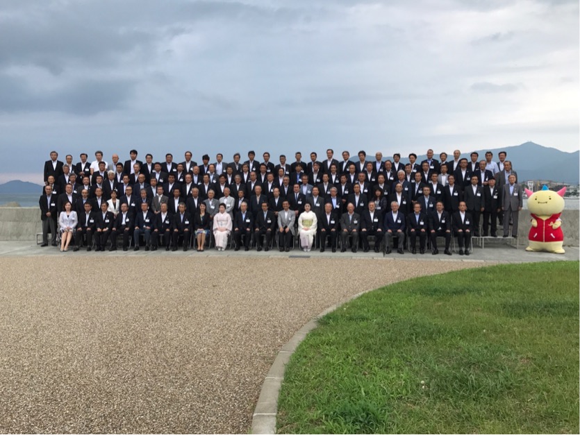 高座の前に、小浜湾を背に「福井県経済界サマースクール」の皆さまと記念撮影。