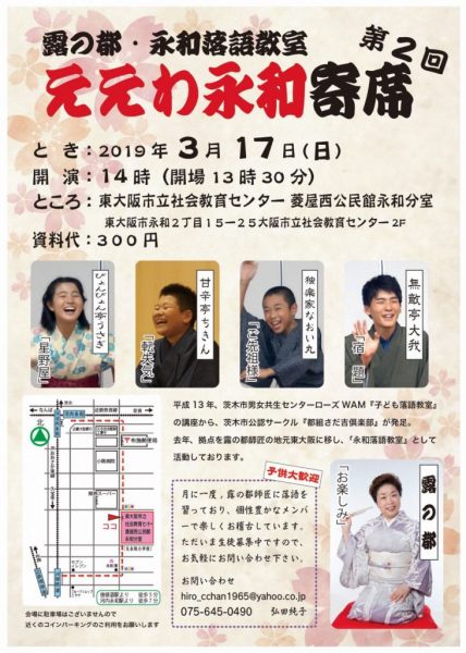 ちきん君と1/13(日)の2時から茨木市男女共同参画センターで「ワムワムらくご」に出演します。桂三扇さんもでます!