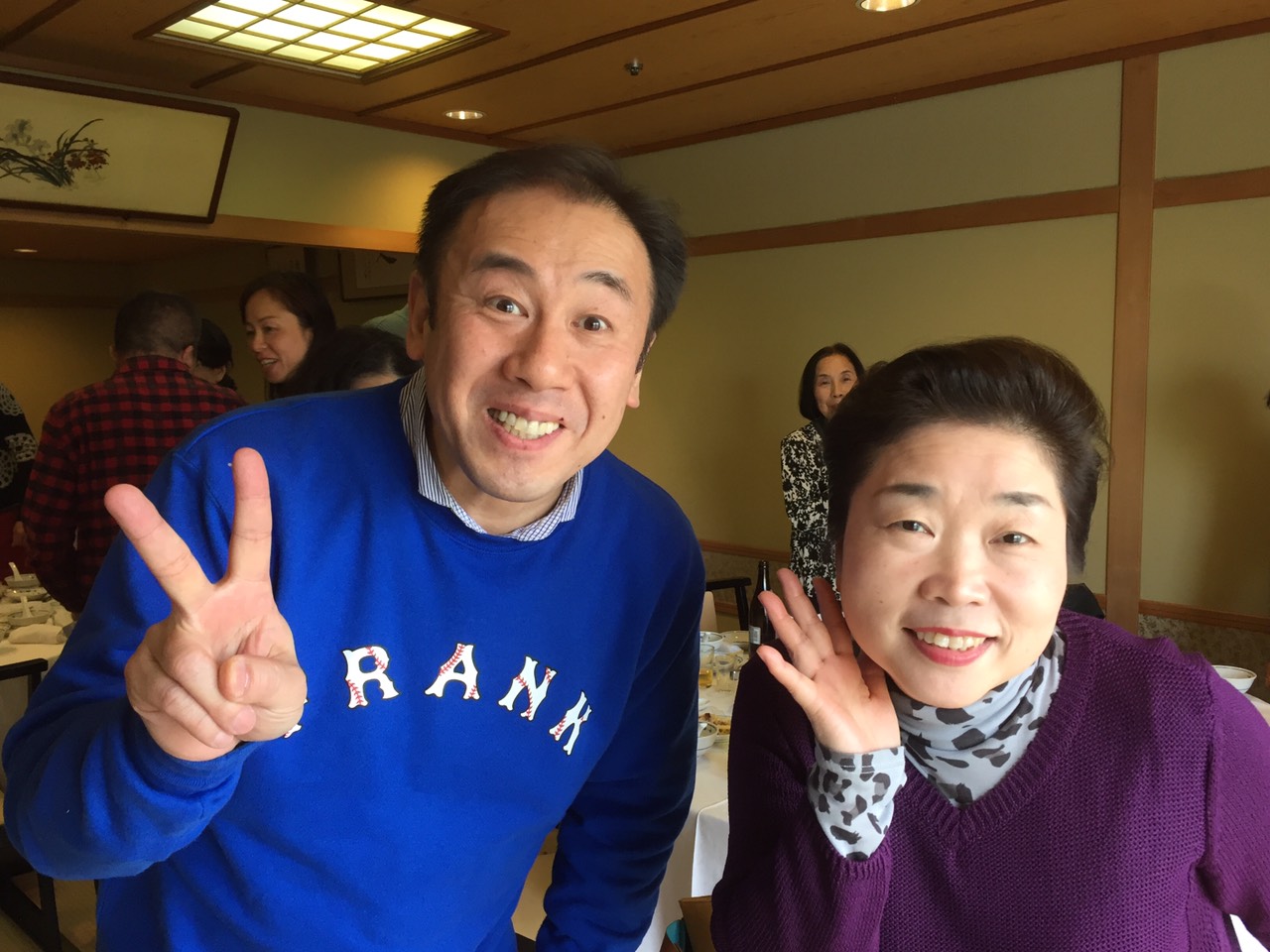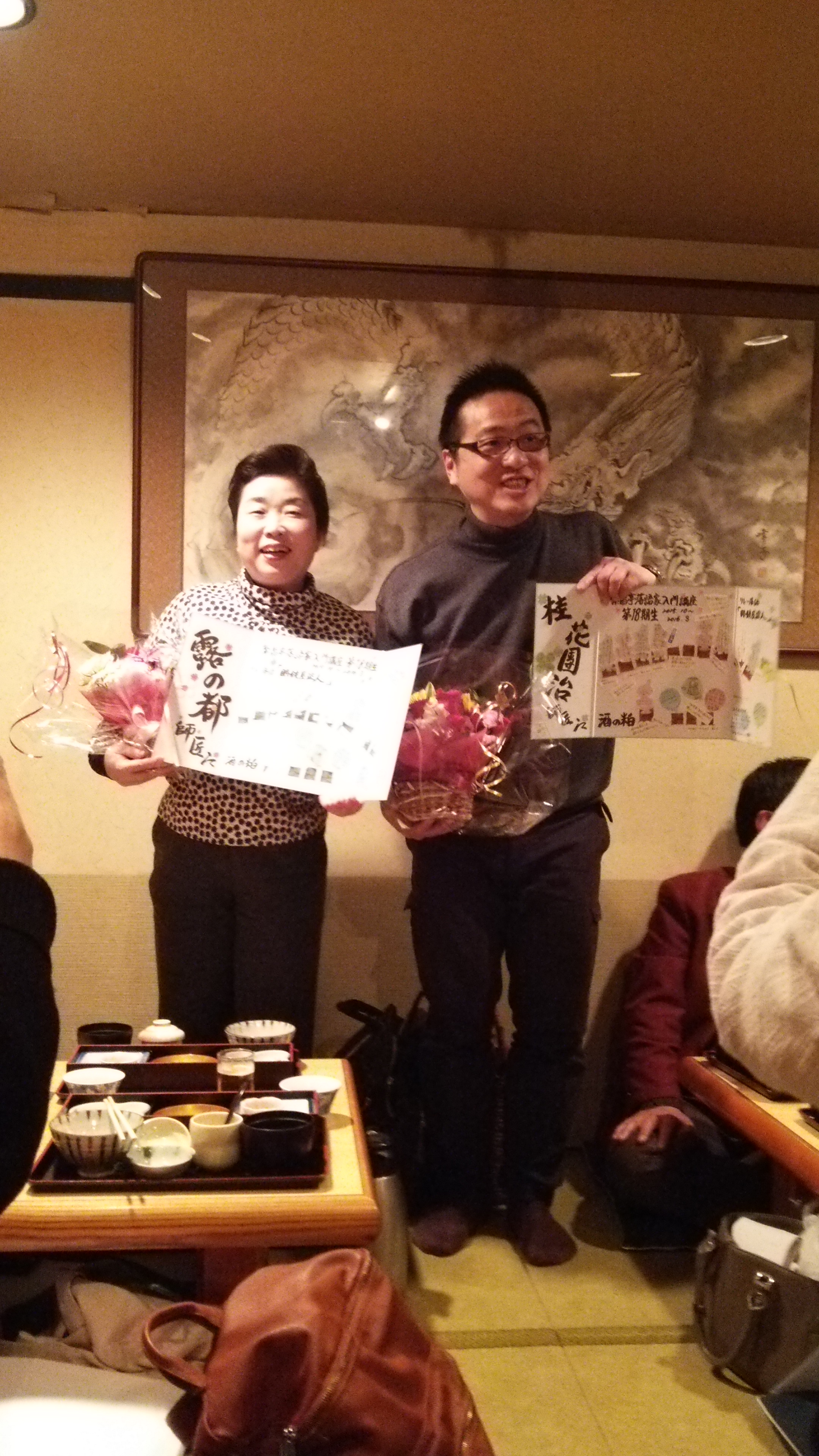 23(水)に初級クラスの打上で、サブ講師の桂花團治さんと、いただいたお花、寄せ書きを持って嬉しい二人です。
