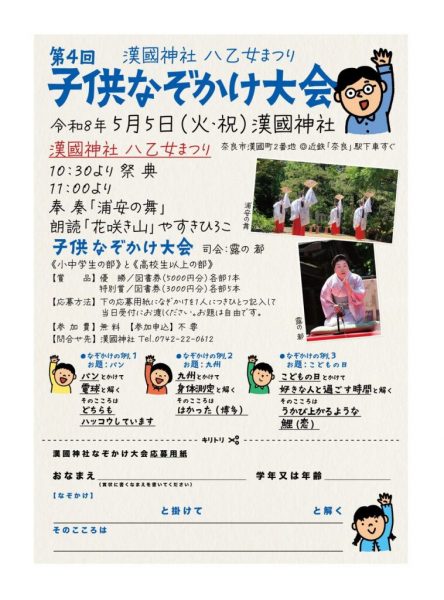 | 出演者 | 10:30~祭典 11:00~奉奏「浦安の舞」 朗読「花咲き山」やすきひろこ 『子供なぞかけ大会』 司会・露の都 *なぞかけをどしどし考えてね。なぞかけのお題は自由です。 *参加申し込みは不要です。 |